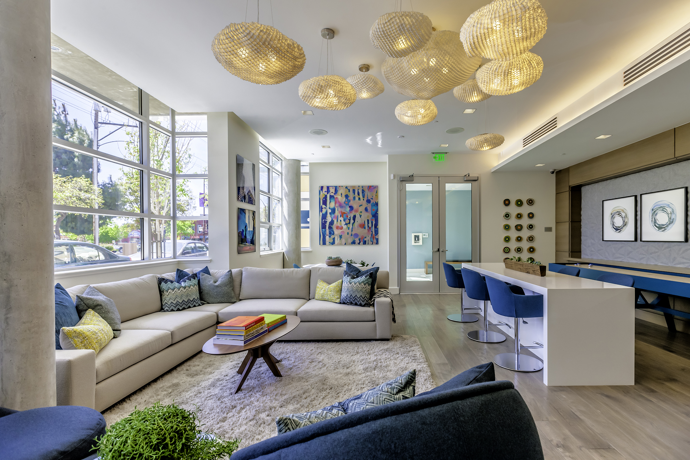 Resident lounge with nano-glass doors that open up to the courtyard